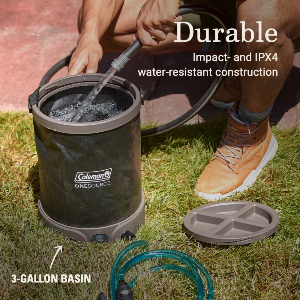 The OneSource system powers your outdoor gear with one interchangeable, lithium-ion battery. It powers the OneSource Rechargeable Built-In Pump Camp Shower Sprayer for cleaning up at camp, washing off muddy pup feet, or washing off kids at the beach. The portable shower is made to last with impact- and IPX4 water-resistant construction, while a soft grip makes it comfortable to carry even when the 3-gallon basin is full. A 6-foot hose is ideal for holding the sprayer over your head, while the adjustable pressure lets you dial in the power without any pumping.